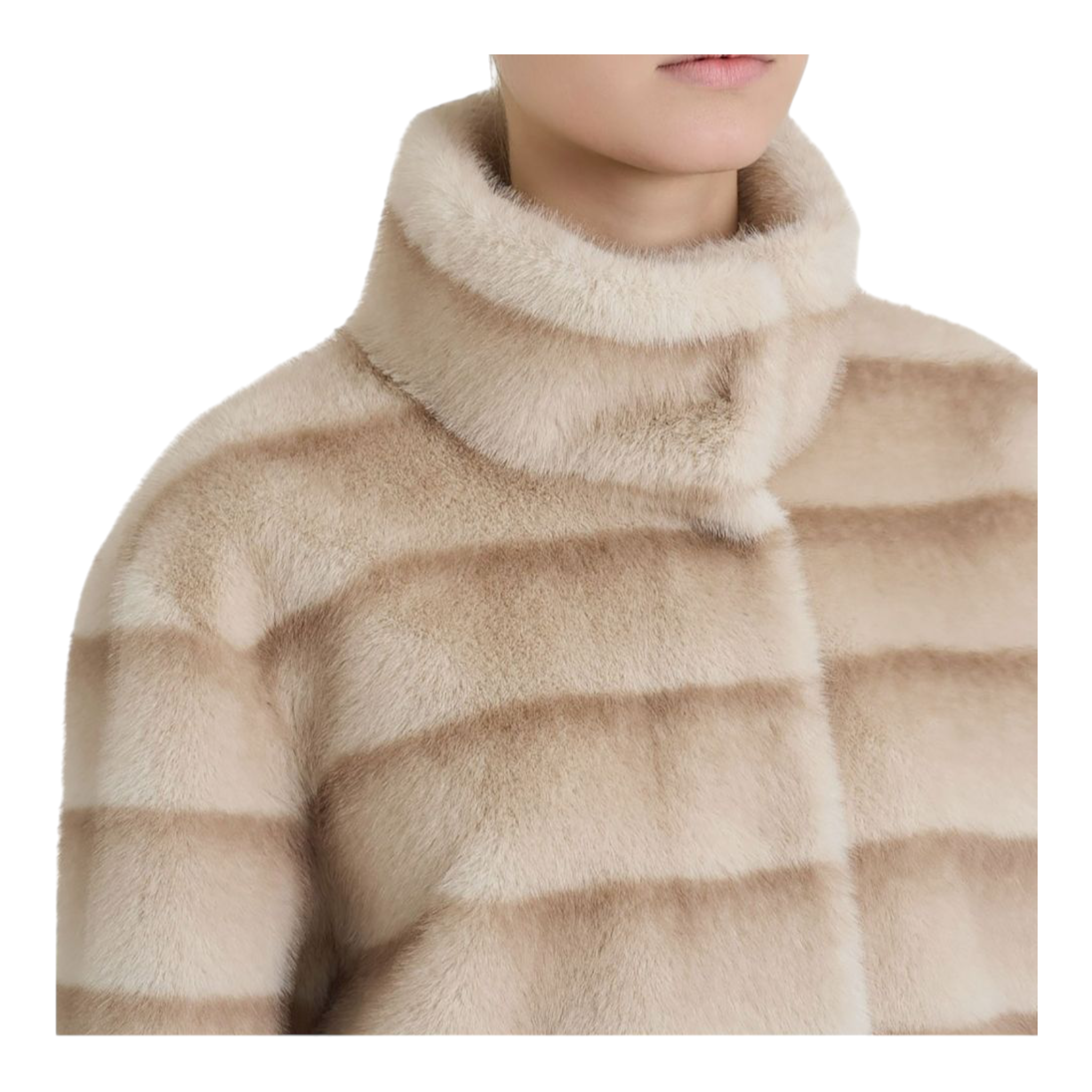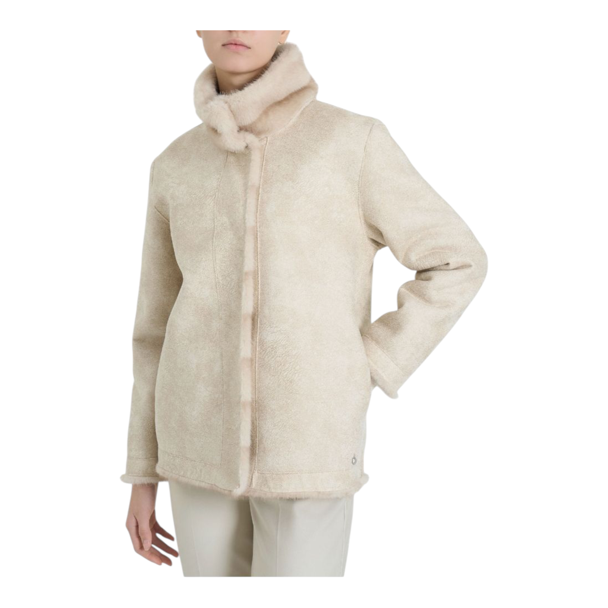 Chiusura frontale con bottoni a pressione e pratiche tasche laterali. Realizzata in vegano fur. Etica, morbide calda di trasforma in base alle occasioni d'uso grazie al design double face.